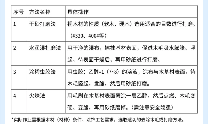 木毛一旦接觸或吸收水分或溶劑,就受濕潤膨脹而豎起來,使顏色無法均勻著色與木紋內部,而堆積在它周圍,出現木紋(導管)內部未著上顏色的不良,打磨后就出現了小白點(芝麻點)。所以,涂飾前一定要充分打磨去除木毛(薄片材料時,要避免砂穿),為涂裝和著色提供一個優質的基底條件。