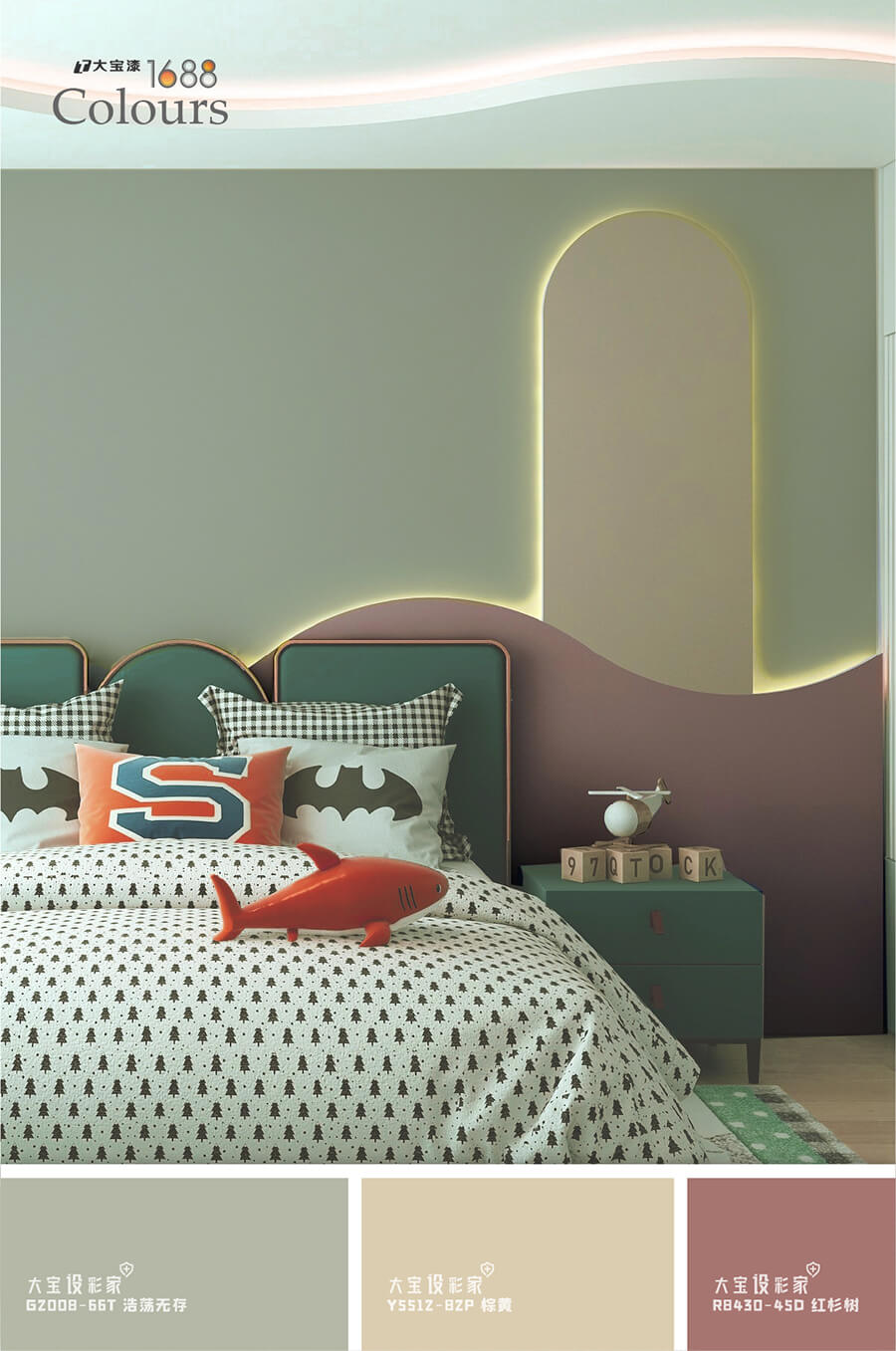 兒童房的設計不妨采用幾何和線條設計,選擇較深的灰綠色為主色調,增加空間中的寬闊感。搭配紅色系,活潑歡快即刻擁入,相比較高飽和度的顏色,加入灰色中和,這種對比色調的搭配,整體空間相互制約抵消,不僅點亮空間,還予人一種賞心悅目的感覺。