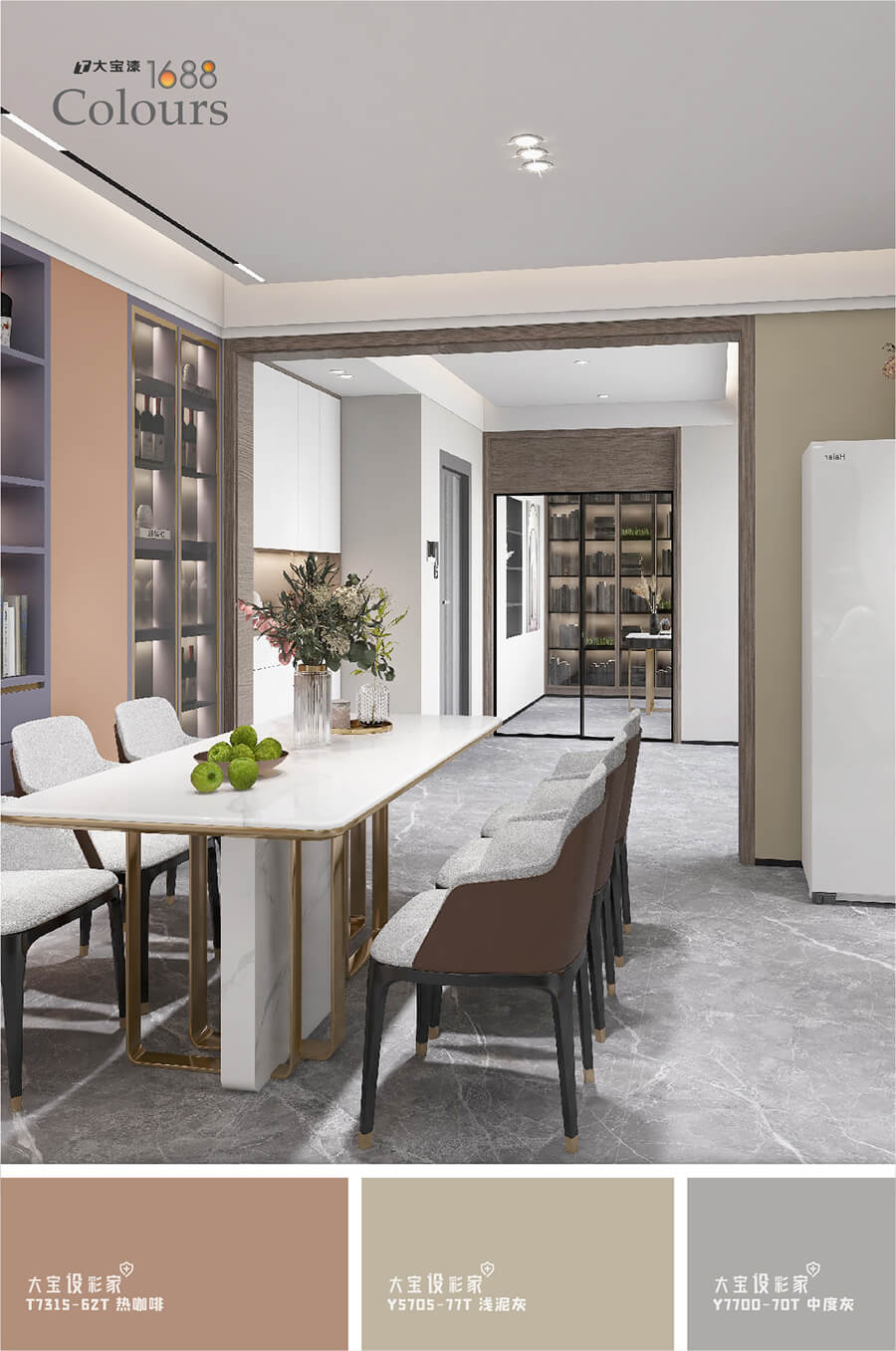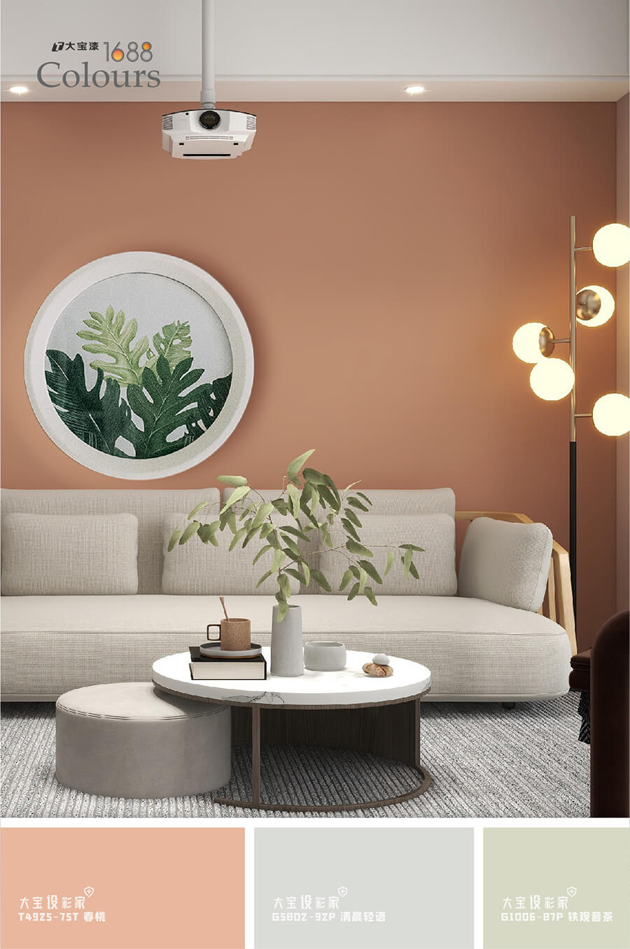 低飽和的色調度,將家居空間中大面積填鋪,大寶春桃橘(T4925-75T)的與眾不同,在于濃而不烈,剛柔相濟,與霧霾灰沙發、大理石紋茶幾、金屬燈飾等材質搭配起來,達到冷暖色系之間的平衡,利用大寶涂料,創造出有靈魂的空間。
