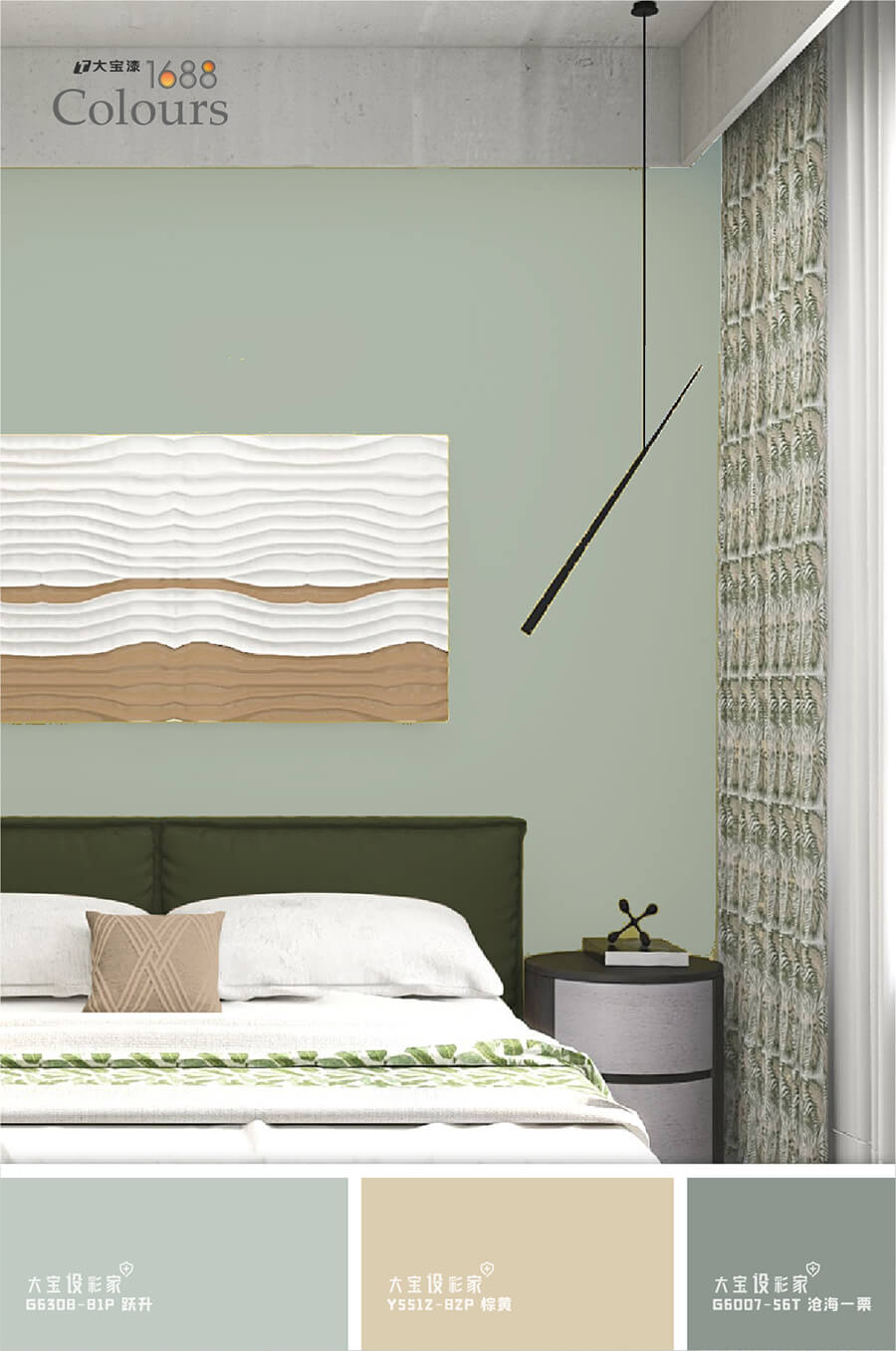 灰綠的莫蘭迪色在空間中百搭零失誤,運用在臥室空間會更舒服穩重,大寶荷采綠(G4940-30A)賞心悅目的顏色,富有治愈氣息,可以作為大量的墻面色彩使用,也可以用櫥柜、茶幾、床組等軟裝作為色彩載體進行局部性點綴,不僅可以點亮空間,還能帶來清爽自由。