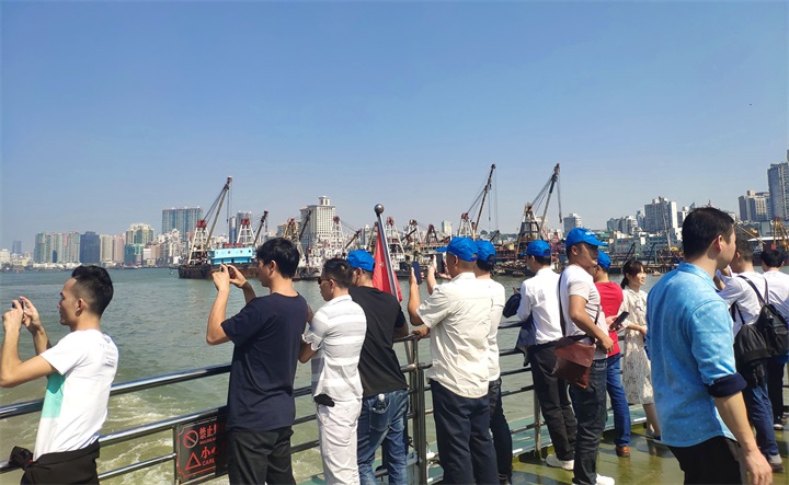 第一站,大家坐郵輪參觀港珠澳大橋。港珠澳大橋是中國(guó)境內(nèi)一座連接中國(guó)香港、廣東珠海和中國(guó)澳門的橋隧工程,位于中國(guó)廣東省珠江口伶仃洋區(qū)域內(nèi),因其超大的建筑規(guī)模、空前的施工難度以及頂尖的建造技術(shù)而聞名世界。在這里,大家能欣賞港珠澳大橋帶來(lái)的震撼視覺(jué)盛宴,感受世紀(jì)工程的宏偉。