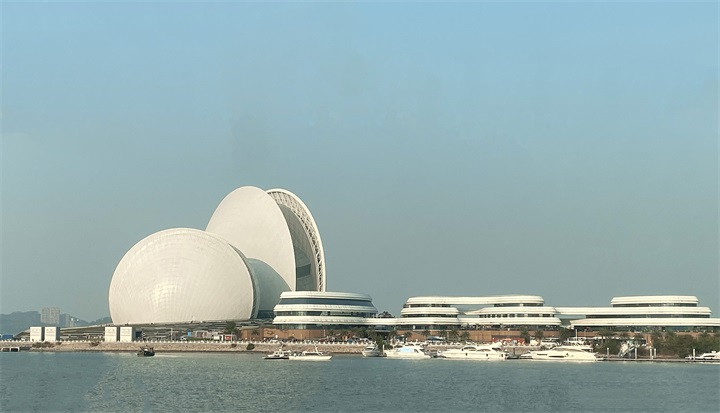 在餐廳用餐后,大家便前往珠海日月貝歌劇院。日月貝歌劇院是中國(guó)唯一建設(shè)在海島上的歌劇院,坐落于珠海情侶路野貍島海濱。大劇院建筑方案的創(chuàng)作構(gòu)思源于大海,用地總體布局形似從海中升起的美麗魚鰭烘托著純凈的雙貝造型,形成“珠生于貝,貝生于?!钡囊饩?。在這里,大家或在拍照留念,或坐在陰涼處欣賞美景。