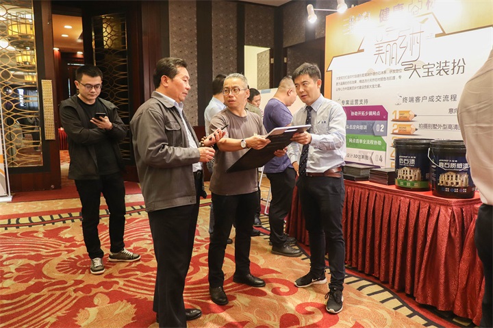 企劃部課長(zhǎng)戴文豐作《2020終端“蛻變”4.0》主題分享。他從市場(chǎng)機(jī)遇與市場(chǎng)方向入手,明確公司2020年終端店面發(fā)力方向:仿石漆店和色彩店。他與經(jīng)銷商們講解了2020年大寶店面政策和終端引流方式。