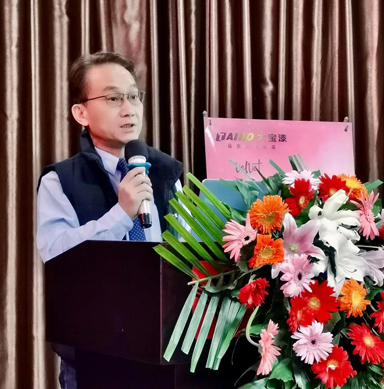 經銷事業部葉子琛副總經理在致辭中,分析當下涂料行業所面臨的問題和機遇,并對未來發展方向做出提示。葉副總說:從2019年上半年開始,大寶成功推出第一代仿石漆產品,兩年多來通過卓越的產品技術研發和涂裝工藝創新能力,如今已更新到第三代,這次主推富含中國文化的24節氣仿石漆第三代色卡,定會為美麗鄉村自建房外墻裝飾市場賦能。
