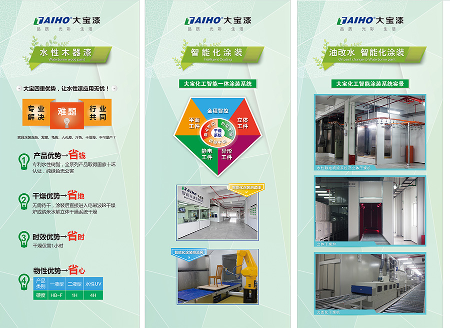 大寶漆經(jīng)過多年的技術(shù)專研,打造出了水性內(nèi)外墻面漆、水性木器漆等綠色環(huán)保產(chǎn)品,并推出水性木器涂料整體解決方案,針對家居行業(yè)面對水性漆干燥難題,斥巨資率先打造中國涂料行業(yè)首條大規(guī)模的智能化水性涂裝測試線,以便滿足客戶的立體工件、平面工件、異型工件等涂裝與干燥的多元化需求,一舉攻破行業(yè)油改水涂裝和干燥的重重難關(guān),領(lǐng)先行業(yè)實現(xiàn)了家具廠環(huán)保自動化涂裝的可能性,為家具企業(yè)油改水的跨越做出了貢獻。