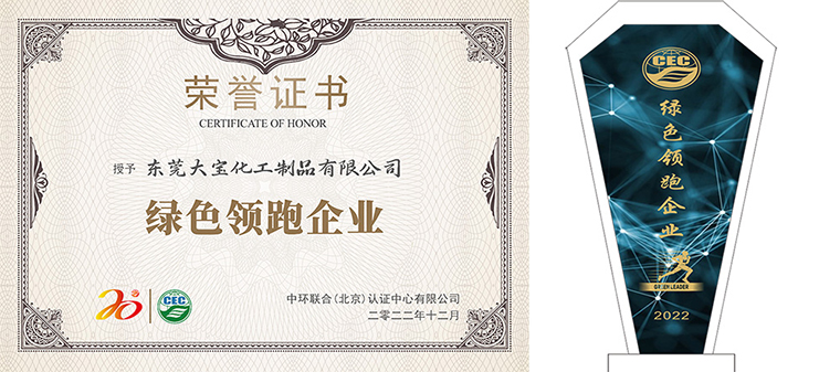 東莞大寶化工制品有限公司榮獲由中環(huán)聯(lián)合認證中心授予的“綠色領(lǐng)跑企業(yè)”榮譽稱號,這是對東莞大寶化工30年來不斷在綠色環(huán)保方面追求卓越的最好嘉許。
