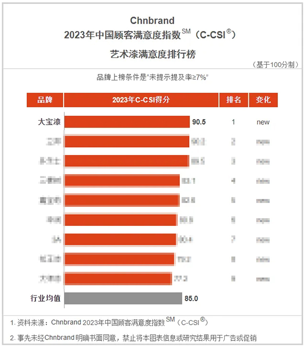 同時,Chnbrand今年首次將藝術漆納入評價范圍,大寶漆以總分90.5登頂“藝術漆滿意度排行榜”榜首。