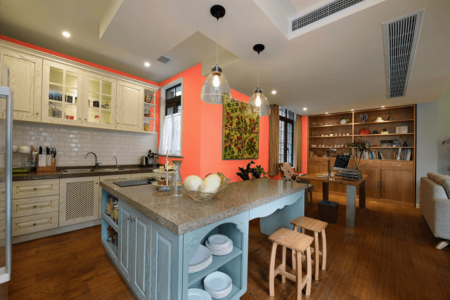 橘色比較跳躍和年輕,適合用在客廳,帶給一家人一個明朗的空間;在廚房和餐廳也適合珊瑚橘色,可以增加食欲和做飯的熱情。大面積珊瑚色墻面加上相近色紅色,空間明亮。
