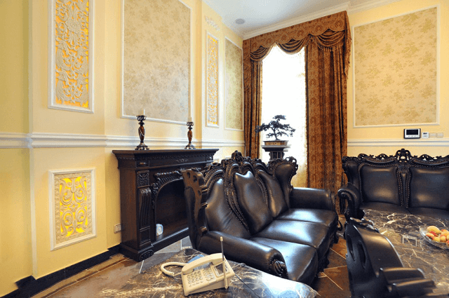 確立主調統率空間的色彩關系。當空間上有幾個色塊時,必須以其中一塊顏色為主,而且其面積,明度,位置大于其它色塊。黑色、白色與白楊金相交對比之下,能激起十分矚目的是絕火花。