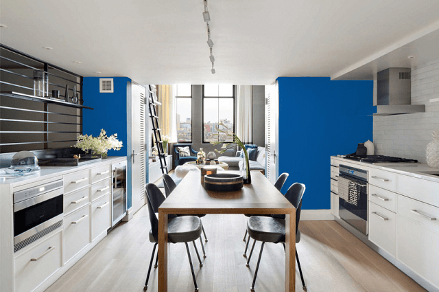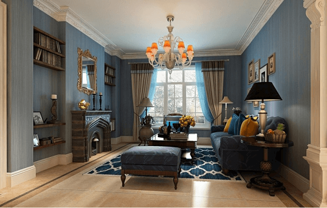 相近色深藍色+公主藍+對比色橙色燈罩點綴,空間飽滿而不亂,沉靜中帶點活潑,一切剛剛好。