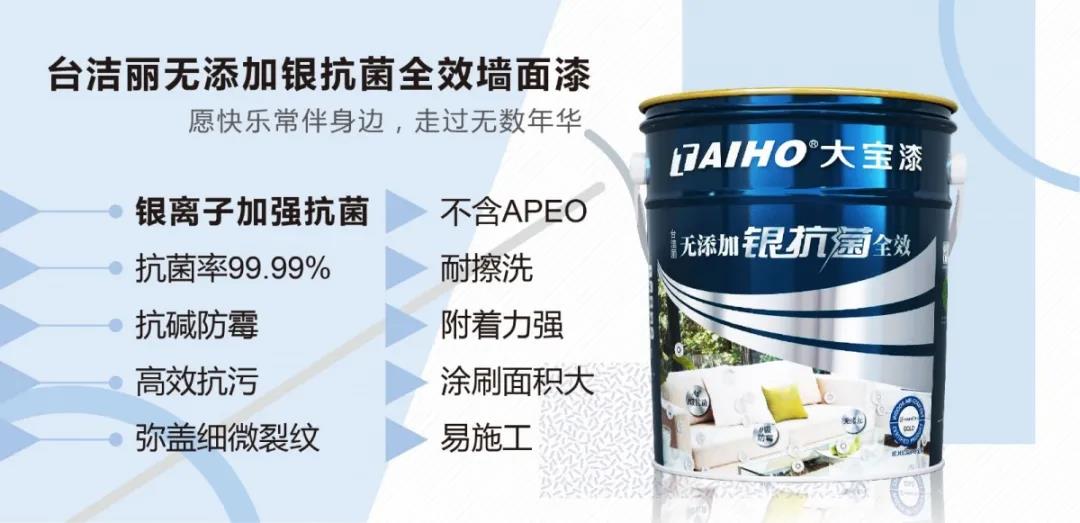 臺潔麗無添加銀抗菌全效墻面漆,特具Ag+銀離子抗菌功能,經國標檢測達到I級抗菌,同時擁有 ”0級防霉‘’、耐擦洗、“無添加”、高遮蓋力、附著力強等全效功能。并取得歐陸IAC-Gold金級認證、法國室內空氣環境檢測A+級認證,帶給家居環境全方位的呵護。