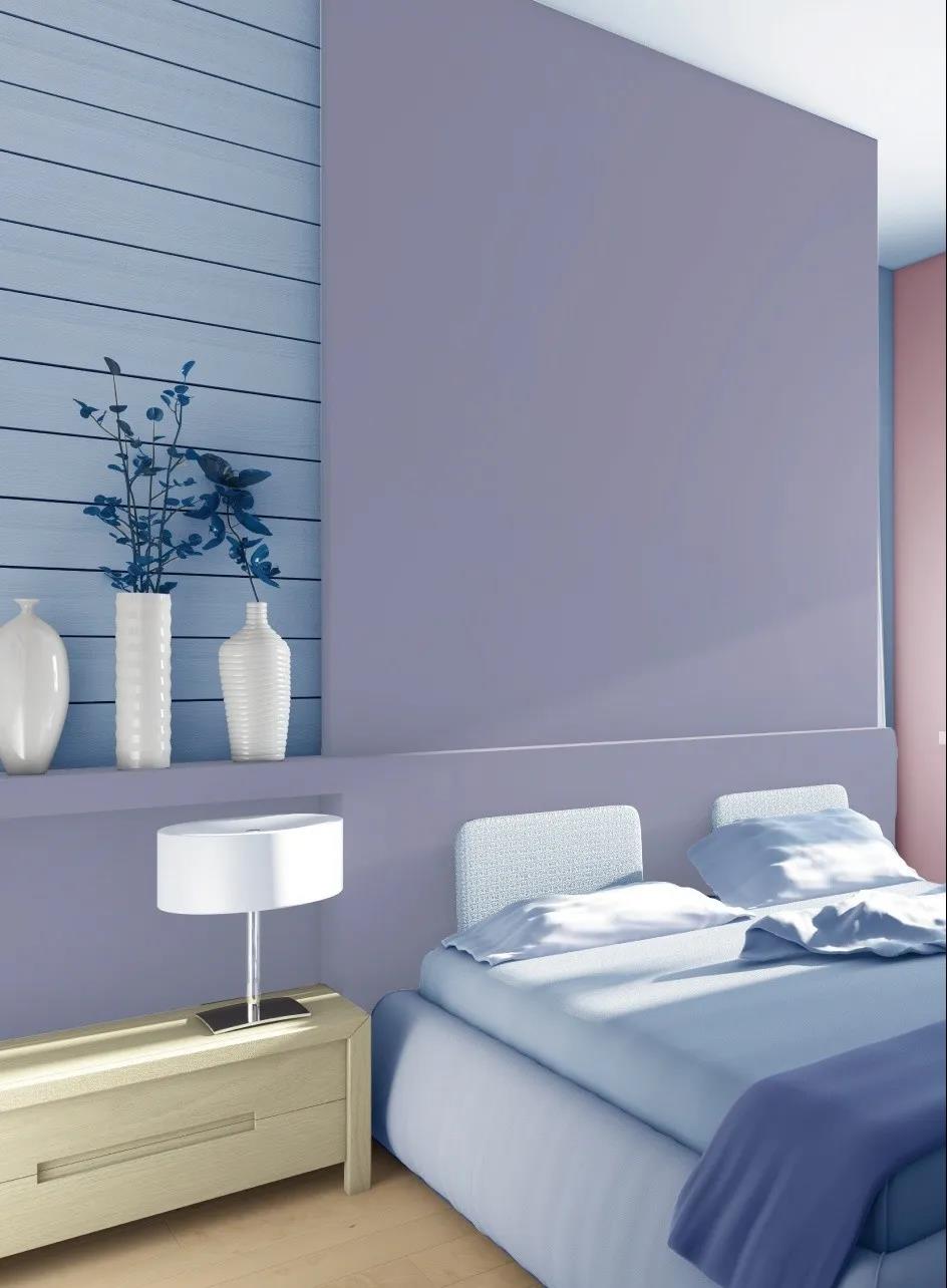 以柔和的紫色裝飾臥室墻面,搭配原木色地板和家具,可使人心情平靜,具有一定的安神效果。
