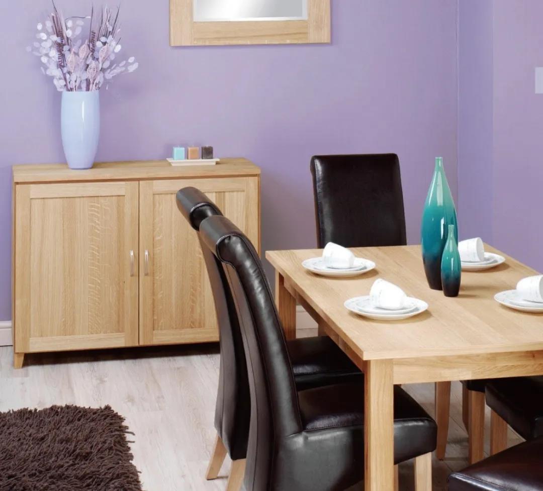 以紫色為餐廳的主色調(diào),搭配原木色餐桌和柜子、黑色椅子,并配以同色系花束點綴,拉大與墻面背景色的差異,使整體空間具有立體感。